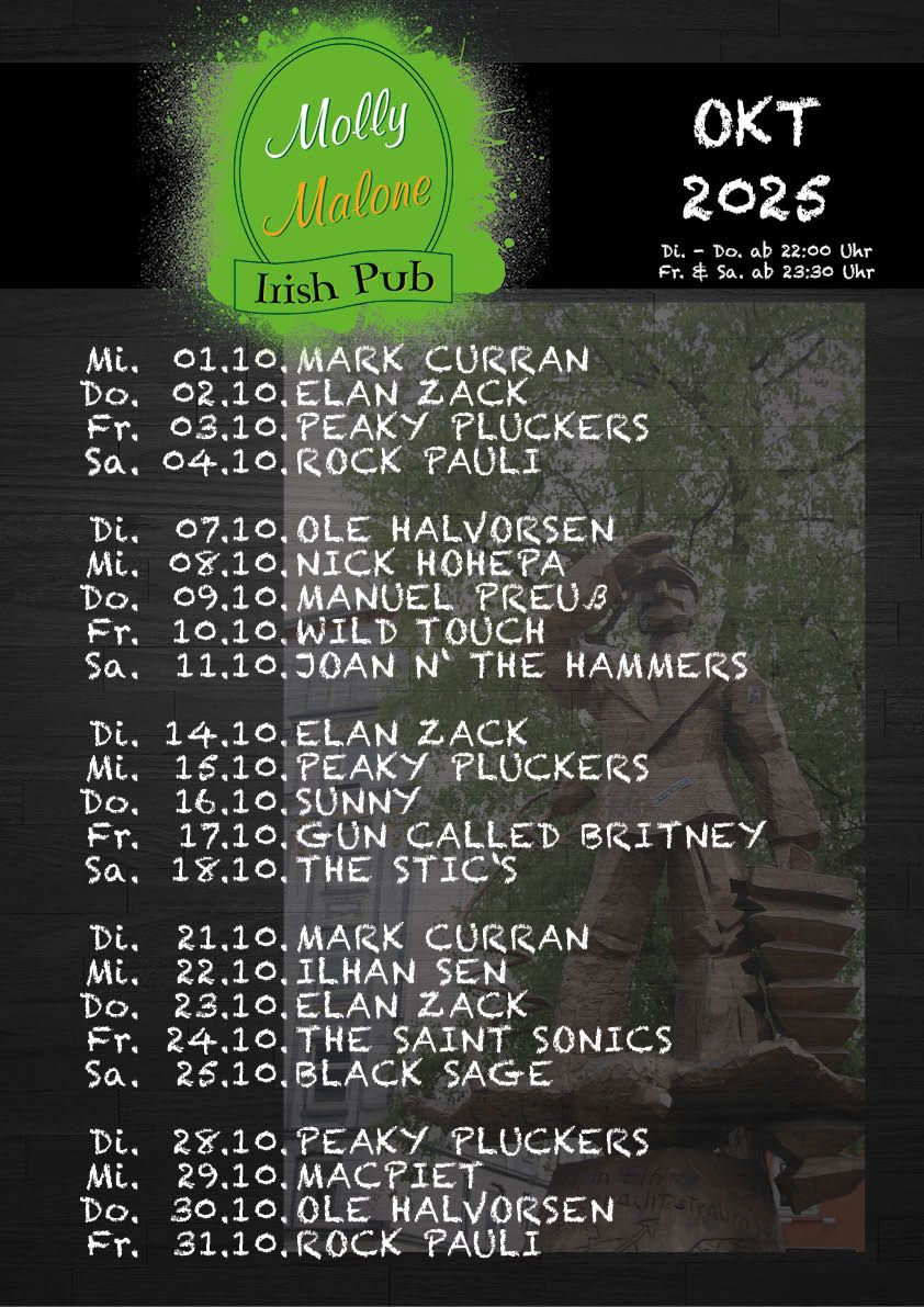 Wer früh kommt, kann sich noch einen Platz am Tresen sichern. Fazit: Wer bei Live-Musik bis in die Morgenstunden feiern möchte, von einem tollen Tresenteam versorgt werden will und einfach Spaß am Leben hat, der ist im Molly Malone genau richtig!