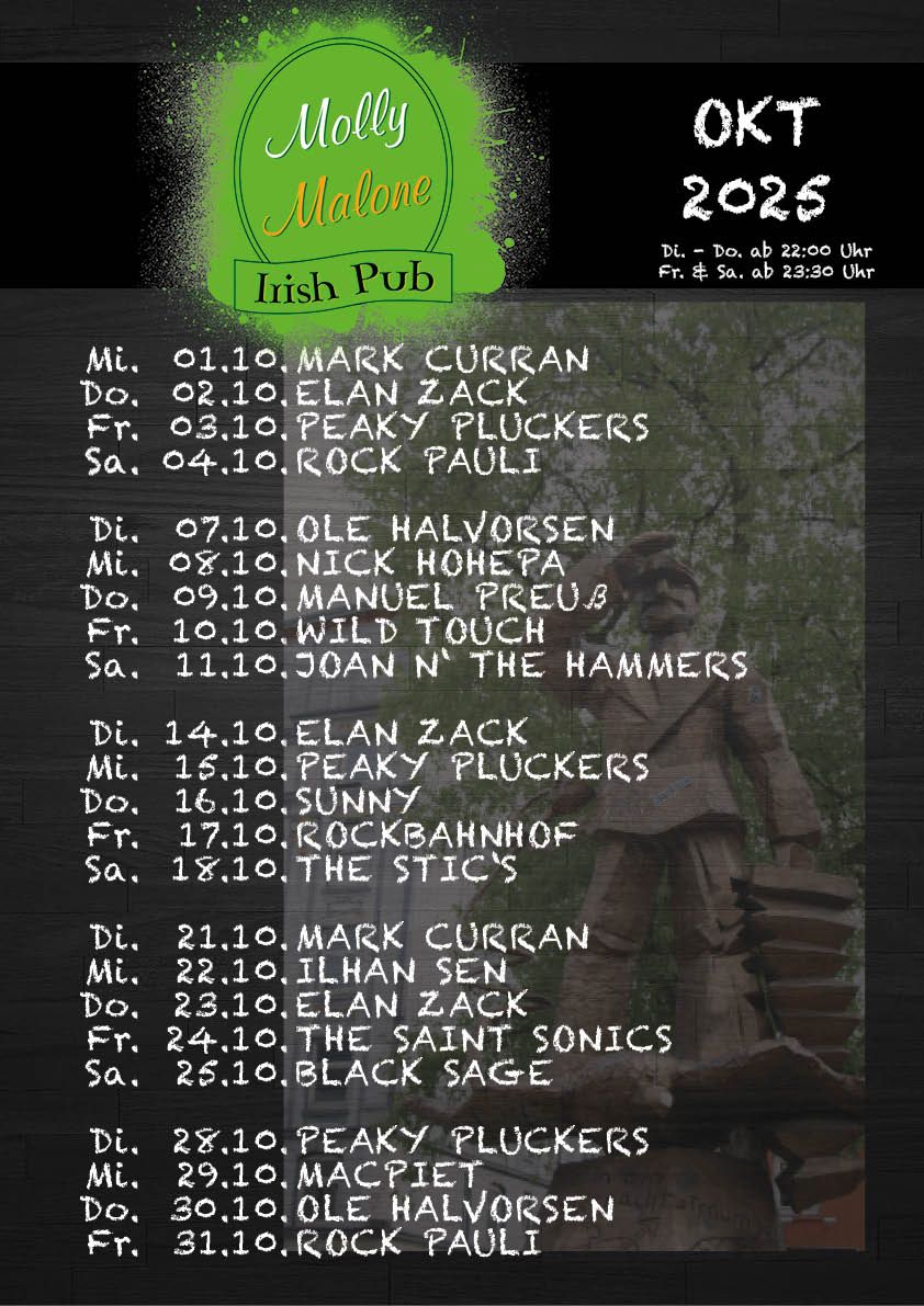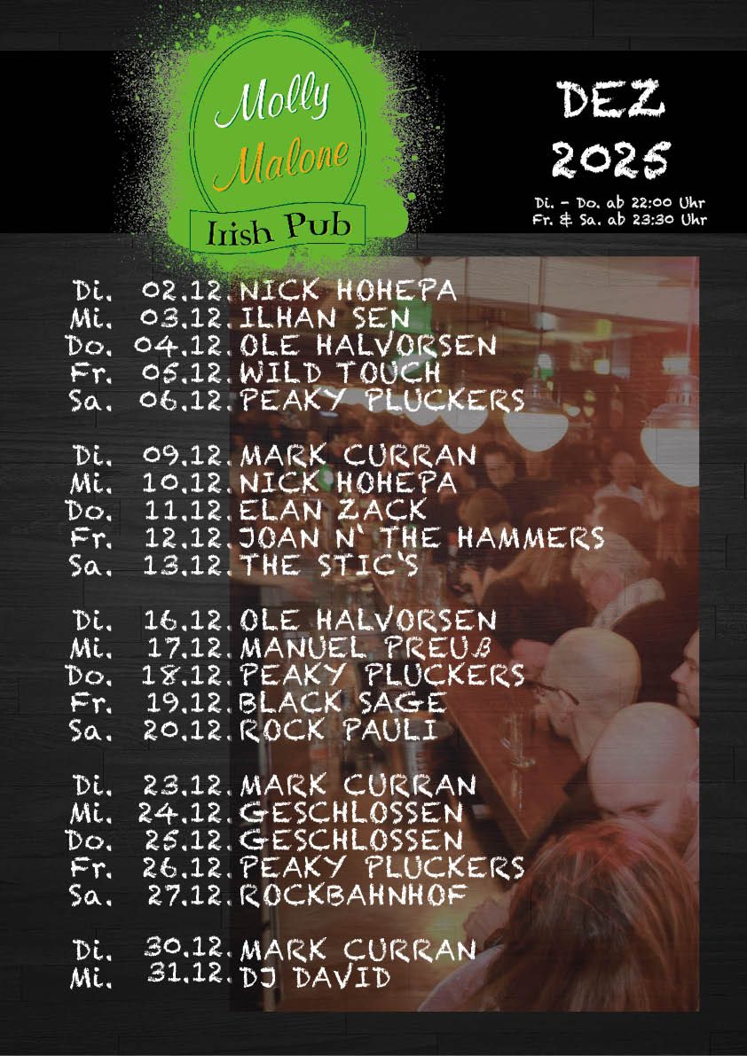 Wer früh kommt, kann sich noch einen Platz am Tresen sichern. Fazit: Wer bei Live-Musik bis in die Morgenstunden feiern möchte, von einem tollen Tresenteam versorgt werden will und einfach Spaß am Leben hat, der ist im Molly Malone genau richtig!